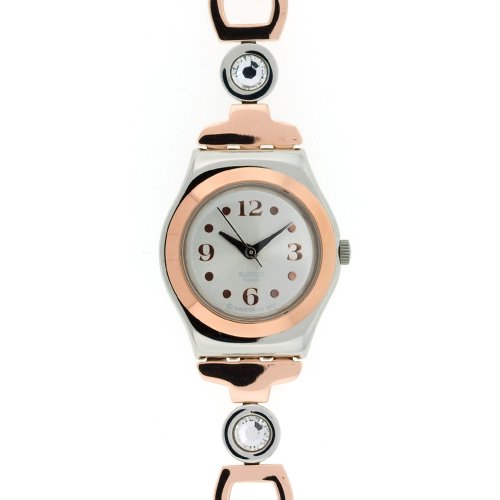 The Swatch Women's Lady Passion Watch is a delicately-crafted timepiece, attractive enough to be worn as a bracelet. The intricate, stainless steel watchband is designed with links of different shapes and colors -- square links in both black- and gold-tones, along with rounded black links and two links inset with sparkling crystals. The white face dial features attractive brown numeral indexes at 12, three, six, and nine o'clock along with dots indicating the other hour indexes. The case is also made from stainless steel for durability and an elegant look while the scratch-resistant mineral window protects against daily wear-and-tear. The Swatch Women's Lady Passion Watch is a stunning timepiece that can be worn either on special occasions or at the office. It is water resistant to 99 feet (30 meters) and powered by Swiss-made ETA quartz movement.